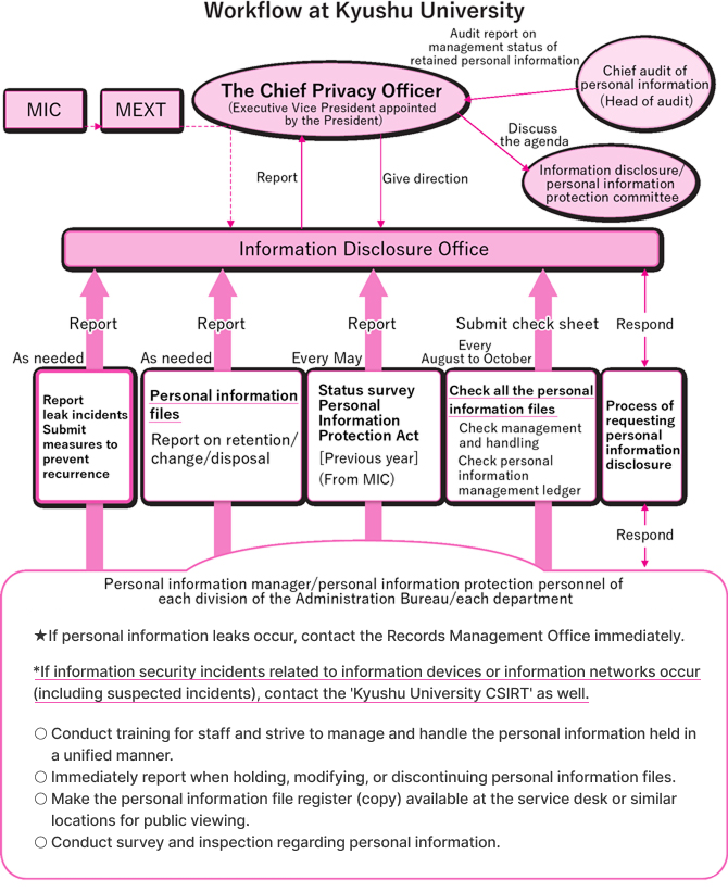 The University has also defined its own law based Regulations on Personal Information Management at Kyushu University, and created the Kyushu University Personal Information Protection Manual, based on the same regulations.