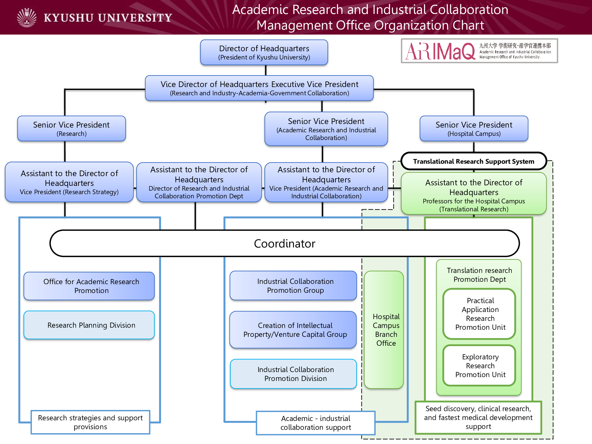 As the body in charge of supporting efforts to promote academic research and managing collaboration with industry and government at Kyushu University, the mission of the Academic Research and Industrial Collaboration Management Office is to contribute to the development of both academic knowledge and society, in accordance with the mission of a national university.