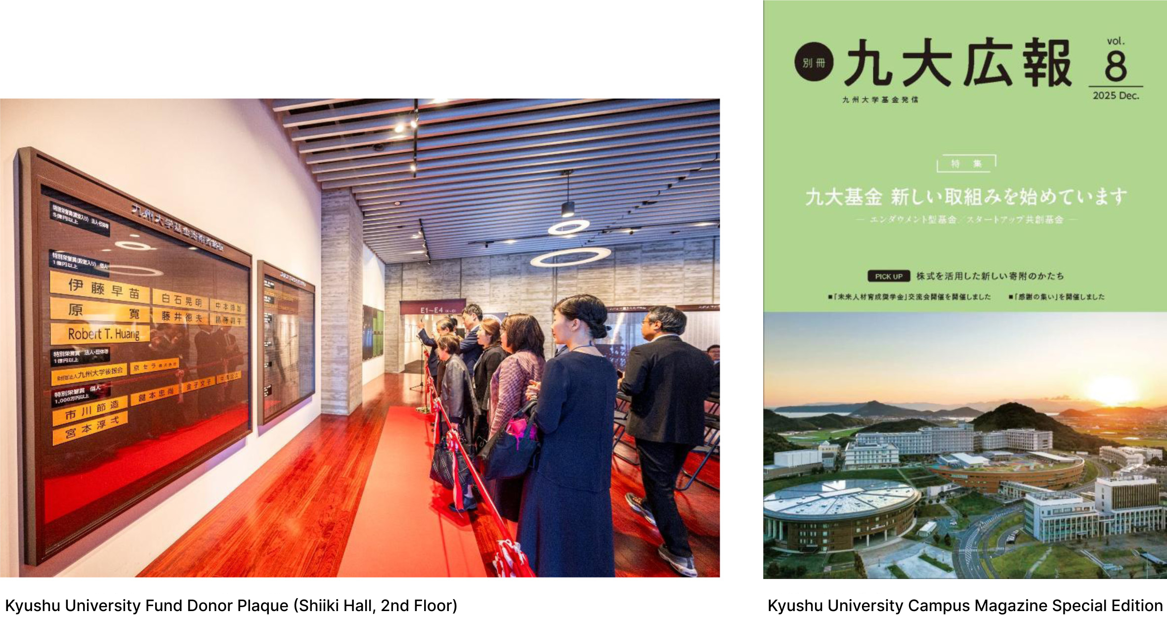 Donors’ names and related information will be published on the Kyushu University Fund website and in its publications (including the Kyushu University Campus Magazine Special Edition). In addition, donors’ names will be displayed on commemorative plaques in accordance with the cumulative amount of donations.