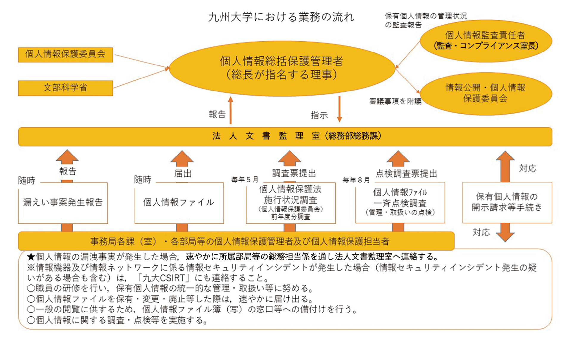また、本学では、法に基づき「九州大学個人情報管理規程」を規定し、同規程に基づき「九州大学個人情報保護マニュアル」を作成しています。