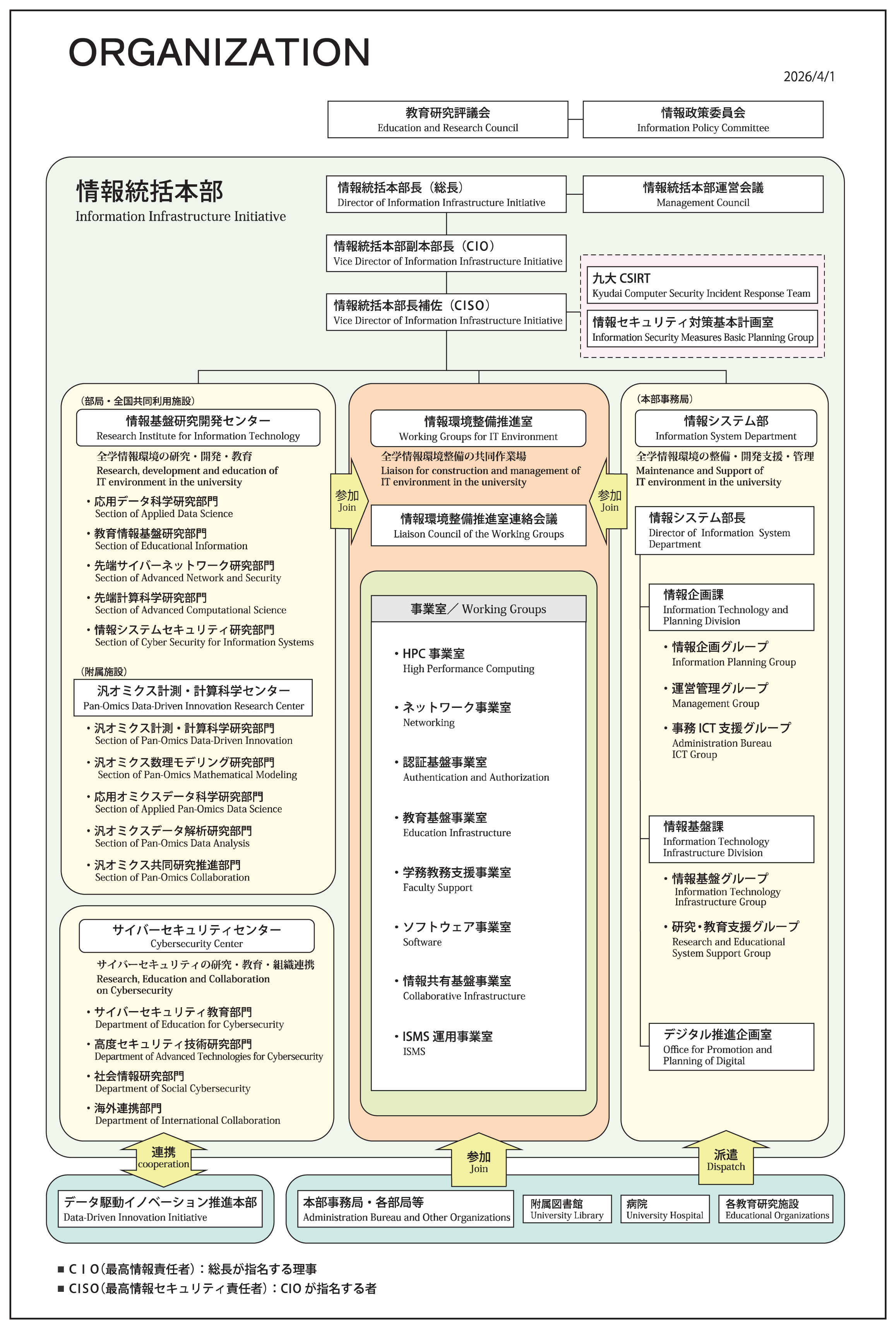 情報統括本部は、「情報基盤研究開発センター」、「情報システム部」並びにこれらの組織を中心に学内部局との連携で設置される「情報環境整備推進室」及び「サイバーセキュリティセンター」の4つの組織を中心として、全学体制で構成されています。(ページ下部「情報統括本部組織構成図」)